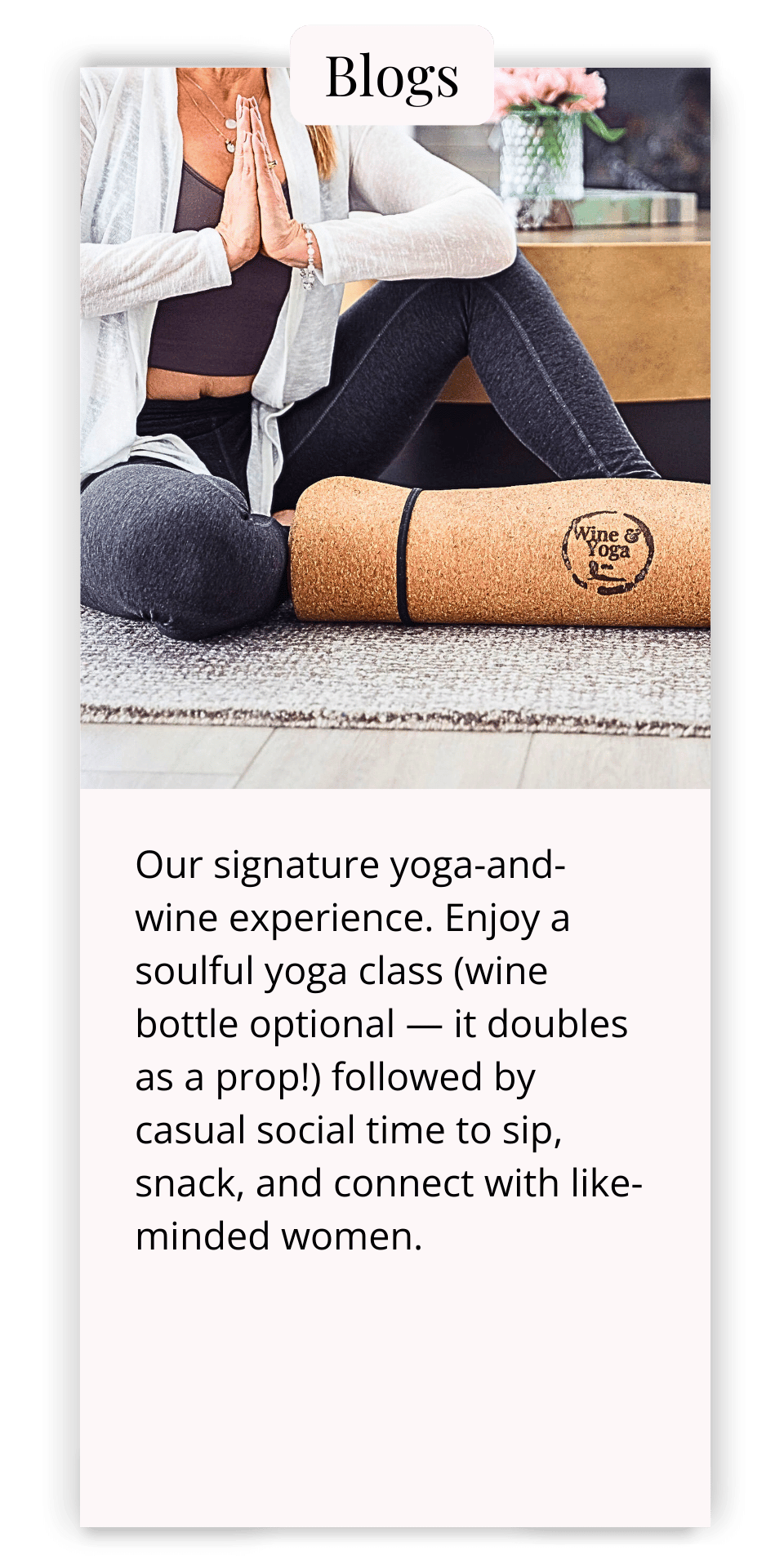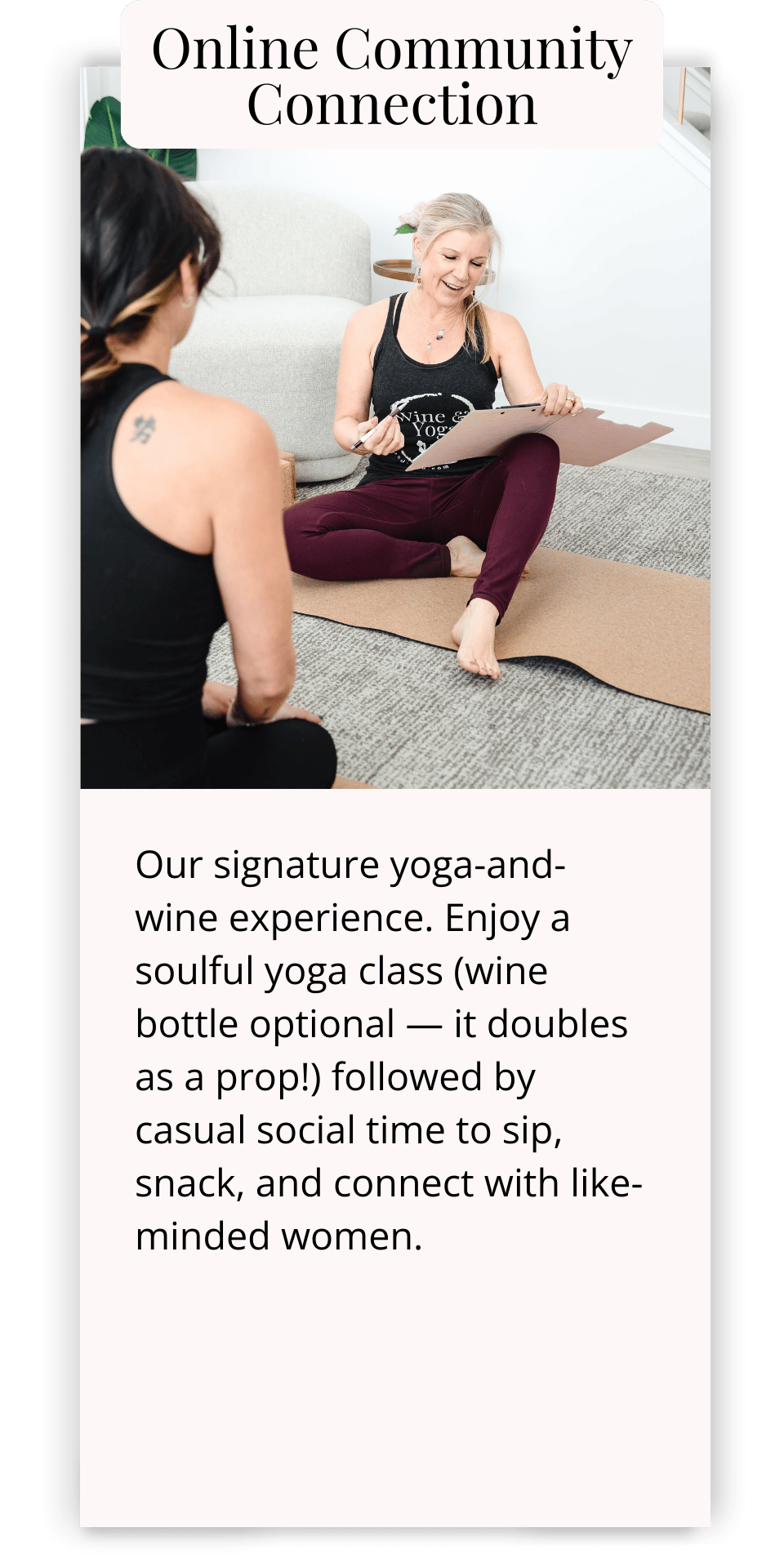 • We help health-conscious women find connection, balance, and alignment—without the pressure of perfection. Think yoga, mindful living, and fun social experiences (yes, sometimes with wine 🍷).