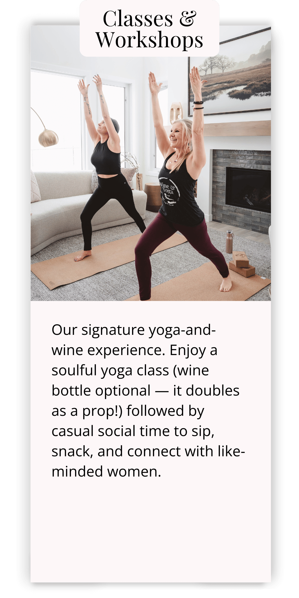 Our signature yoga-and-wine experience. Enjoy a soulful yoga class (wine bottle optional — it doubles as a prop!) followed by casual social time to sip, snack, and connect with like-minded women.